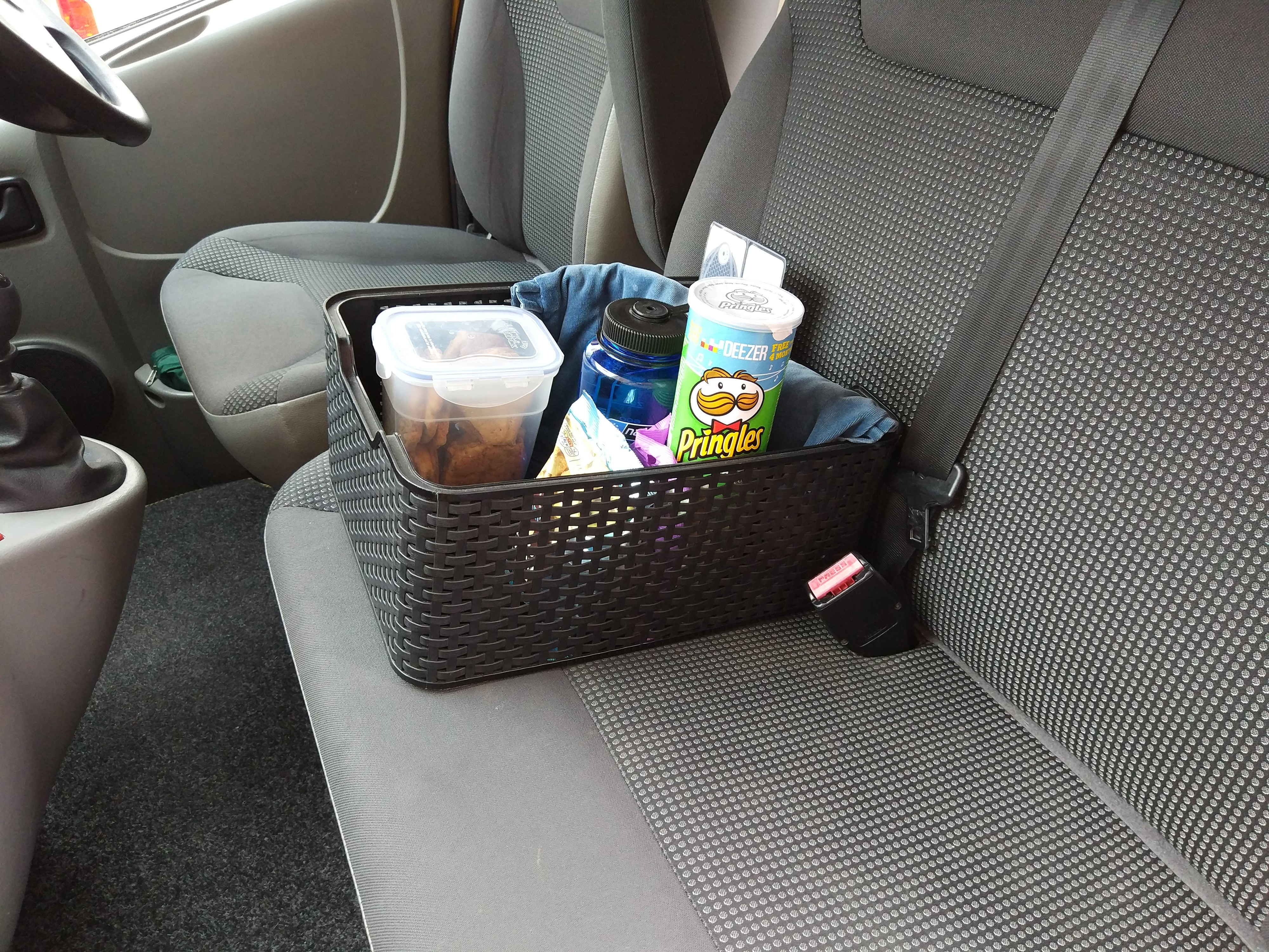 Back when we hired cars, we used to have a ‘car bag’ of useful things that came with us. With the van, most things are permanent, but we’ve recently started using a ‘van box’ and it has been fantastic – keeping goodies tidy in the front, while easy to carry to and from the house. Simple idea, but brilliant.