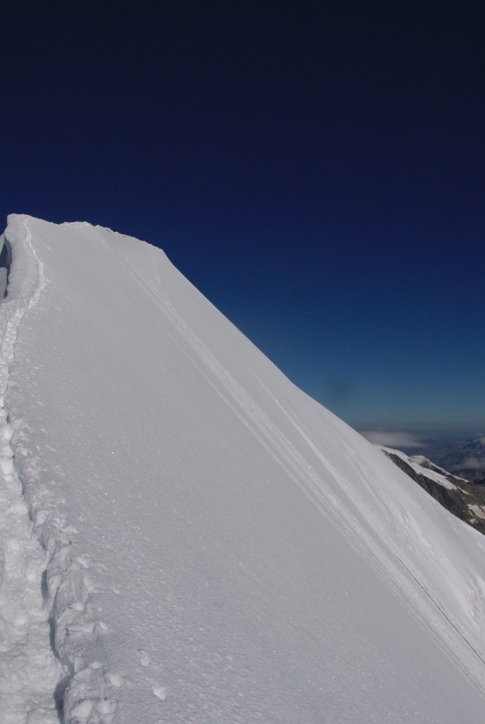 P1090459 Published February 10, 2019 at 2238 × 3343 in Alps 2018 An attempt to give a sense of the narrowness and exposure – the right hand snow field dropped away steeply for many hundreds of metres