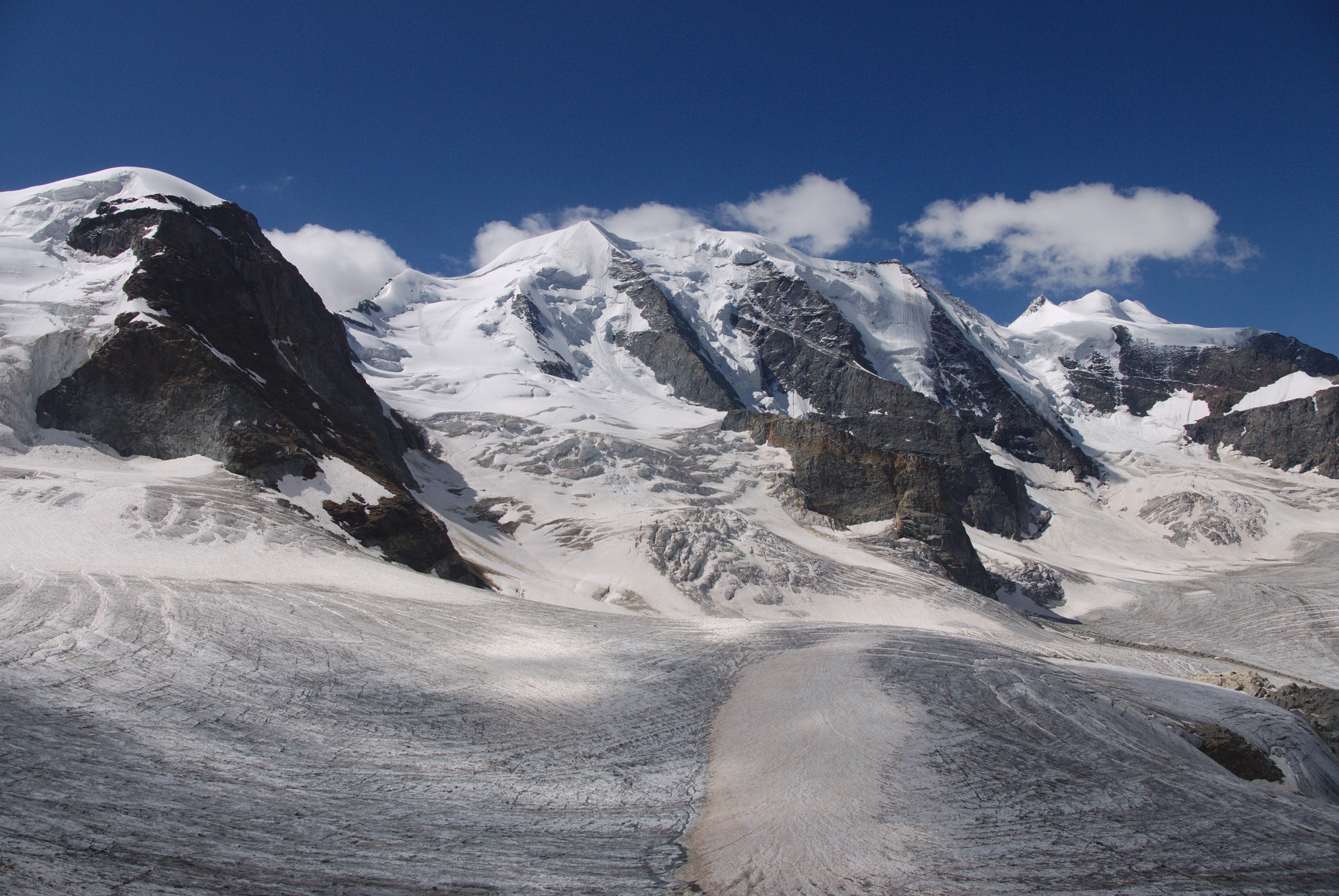P1090489 Published February 10, 2019 at 4016 × 2688 in Alps 2018 A look at Piz Palu, with the three summits. One of the best glacier/snow alpine days.