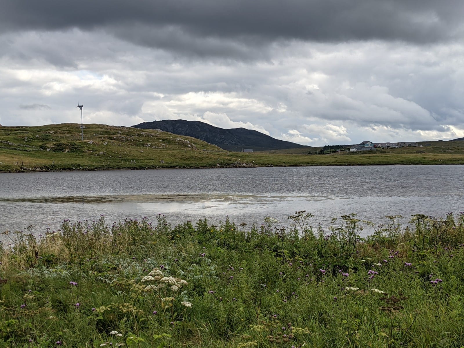 Loch a’ Bhaile near the campsite (Siabost), with wind turbine