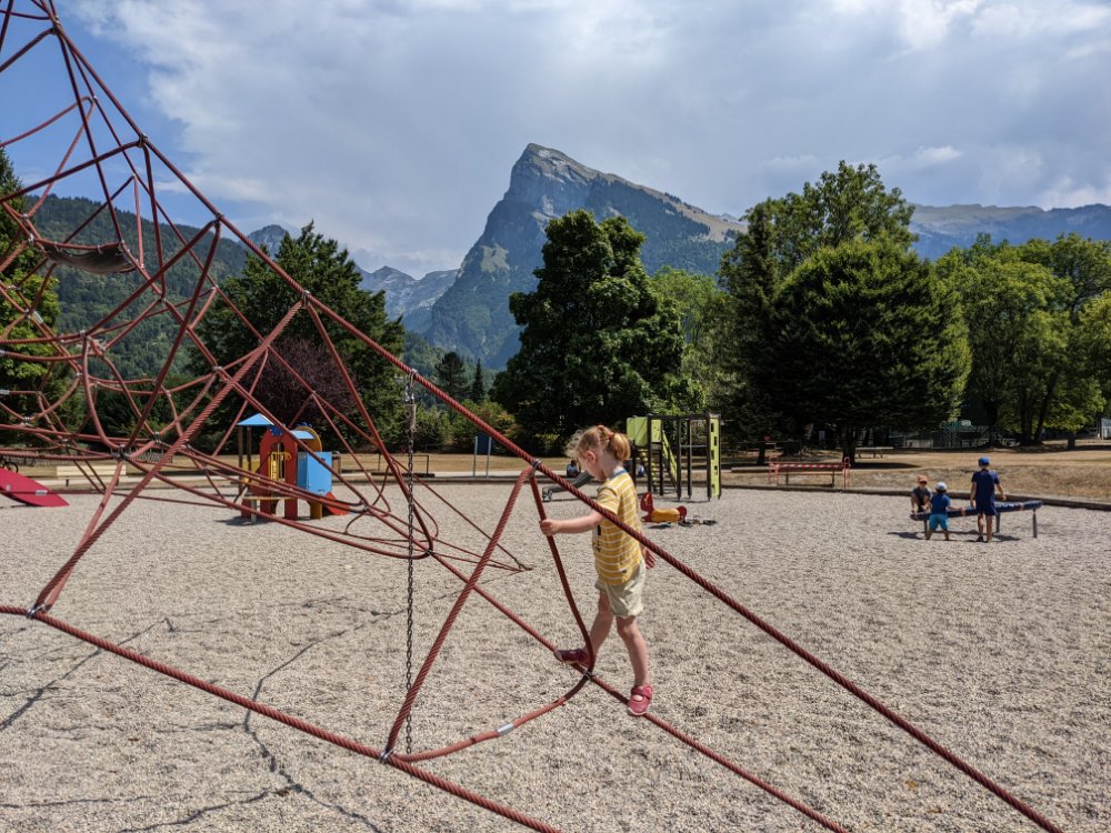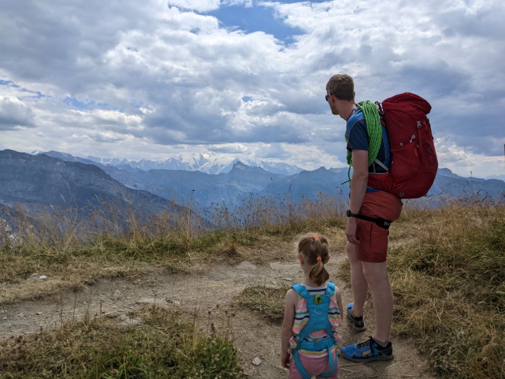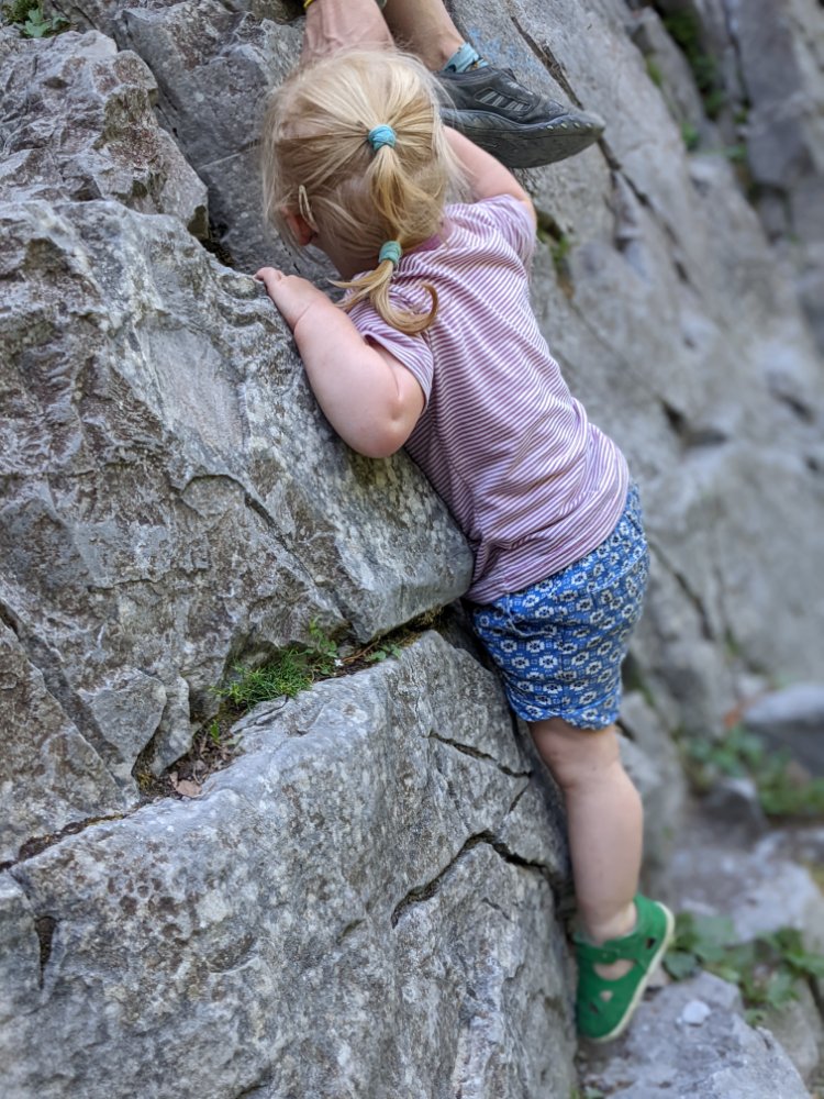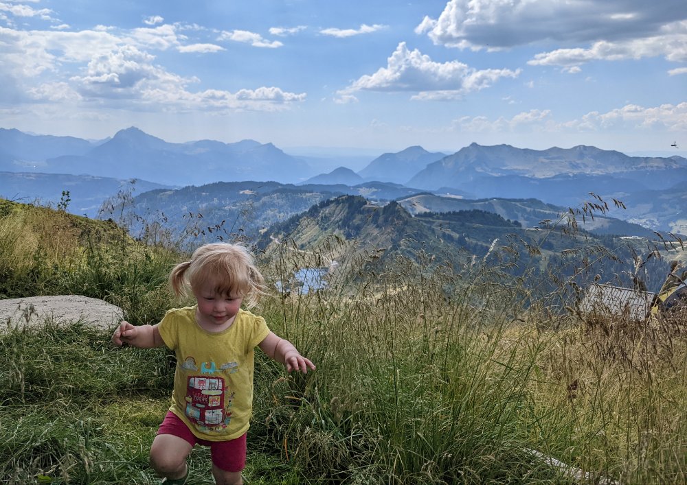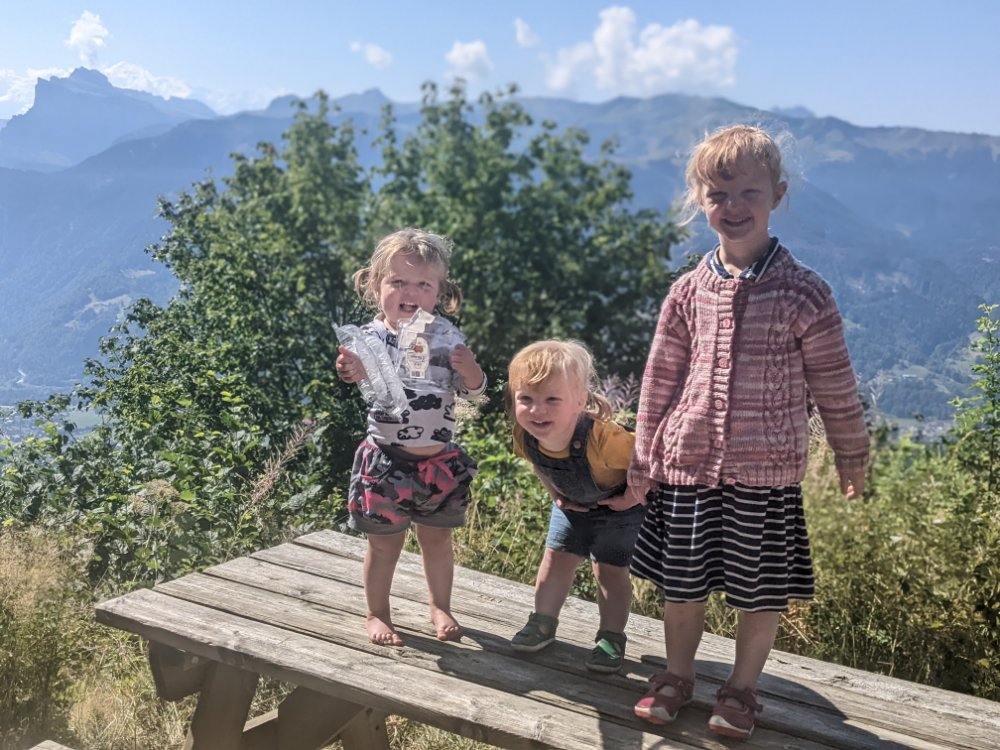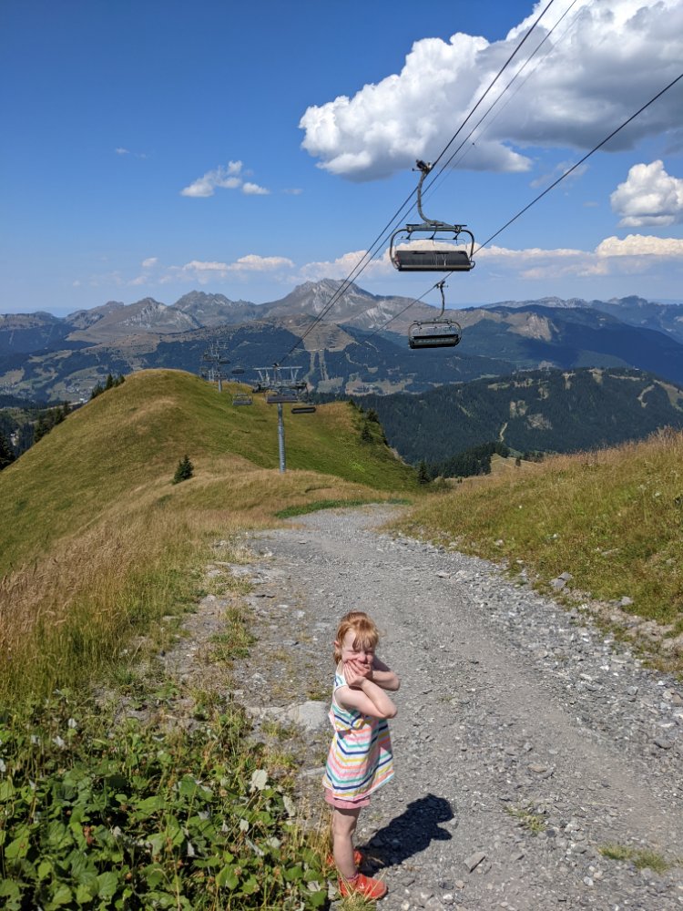 Arty beech leavesClimbing! In the shade! Jess preferred scrambling around the bottom of the cragShe did try a route though First climbing for Mummy in over four years (and first leading since I can’t remember when) Sitting on a ledge Claire desperate to climb tooCrag life Watching… Back to Col du Joux Plane for a walk the other wayJess was fascinated by the chairlift – we ate lunch at the lift station as it was the only shade and got a bit of a shock when the chairs unexpectedly started movingFinally a snowy view – the Mont Blanc massifScrambly step (cabled, but a rope for Jess) On up the ridgeThe top! (High point of the holiday, 2090m)Geological viewRidgyExploring some skiing infrastructure Toddling with a backdropCan’t keep up with JessMont Blanc through the grassCafe direct (about to join up with our previous route)