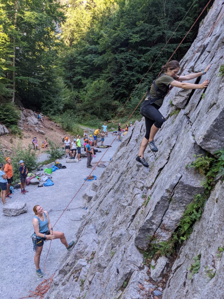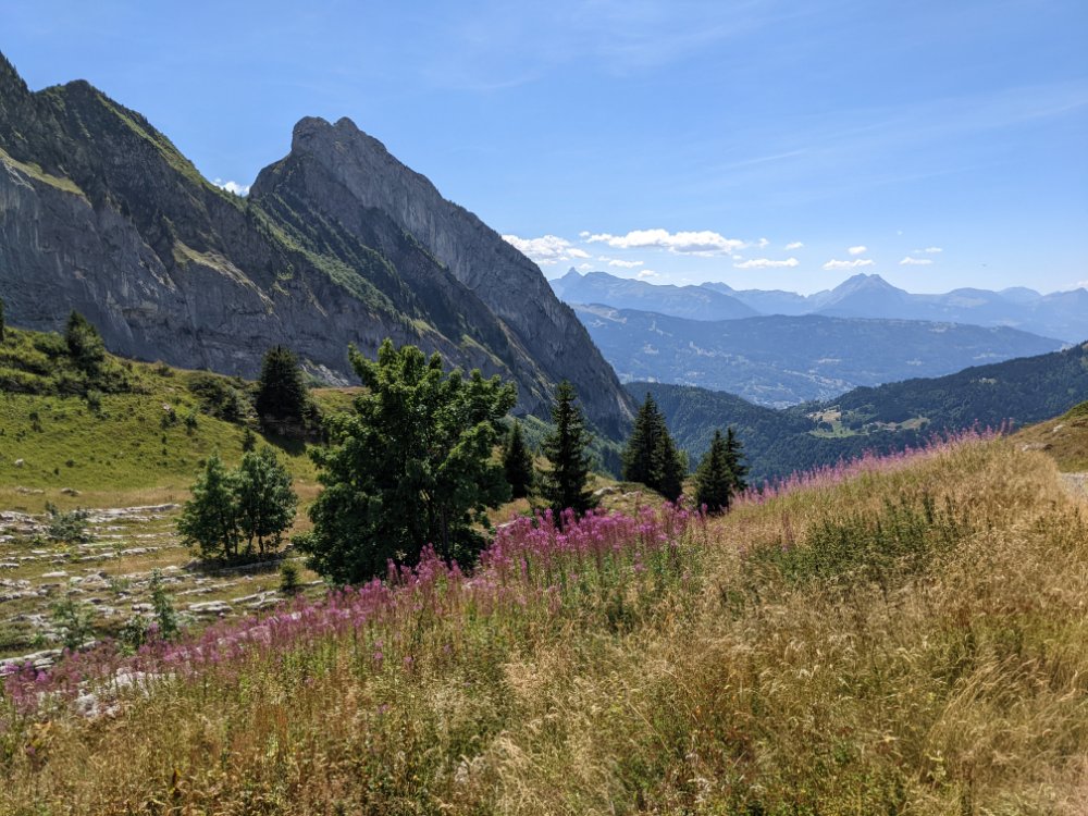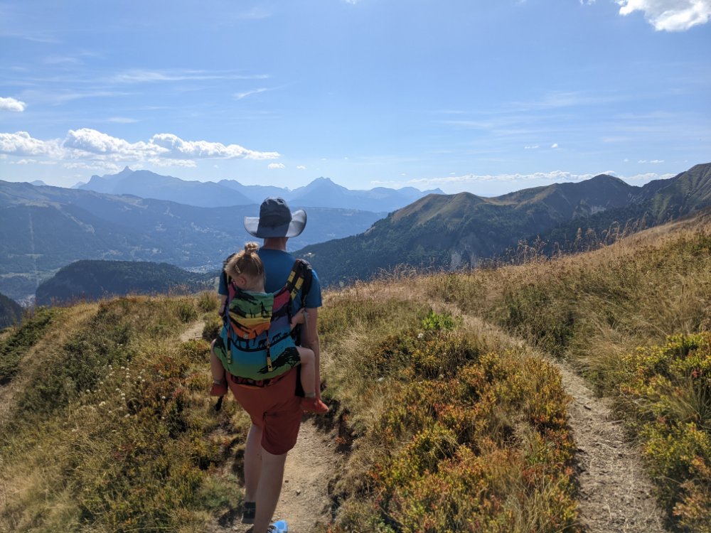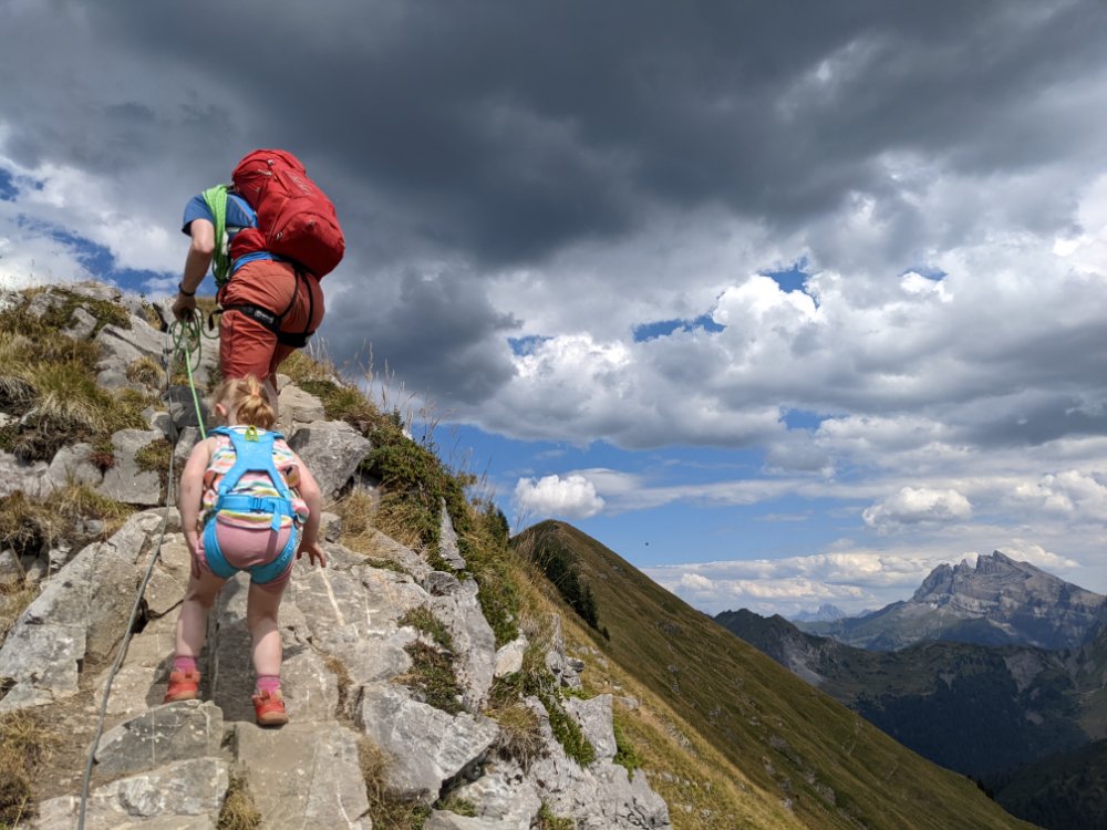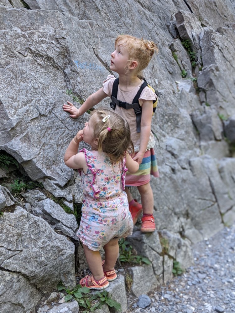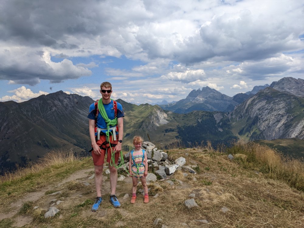 Arty beech leavesClimbing! In the shade! Jess preferred scrambling around the bottom of the cragShe did try a route though First climbing for Mummy in over four years (and first leading since I can’t remember when) Sitting on a ledge Claire desperate to climb tooCrag life Watching… Back to Col du Joux Plane for a walk the other wayJess was fascinated by the chairlift – we ate lunch at the lift station as it was the only shade and got a bit of a shock when the chairs unexpectedly started movingFinally a snowy view – the Mont Blanc massifScrambly step (cabled, but a rope for Jess) On up the ridgeThe top! (High point of the holiday, 2090m)Geological viewRidgyExploring some skiing infrastructure Toddling with a backdropCan’t keep up with JessMont Blanc through the grassCafe direct (about to join up with our previous route)