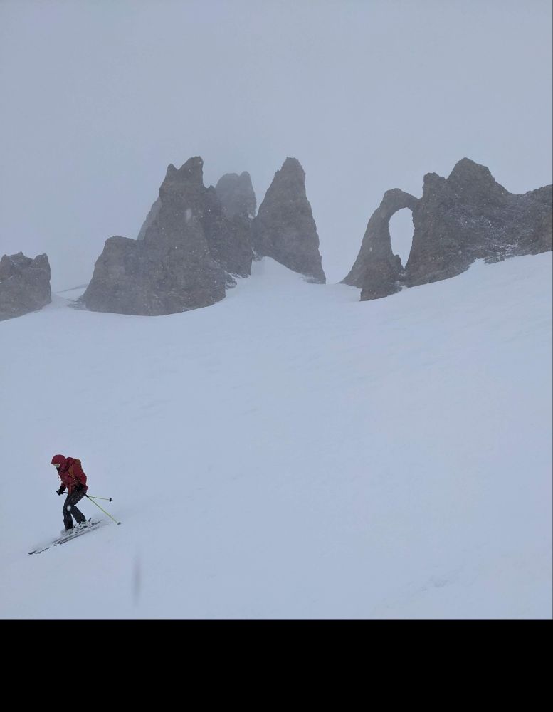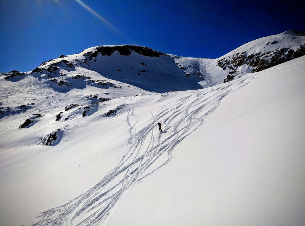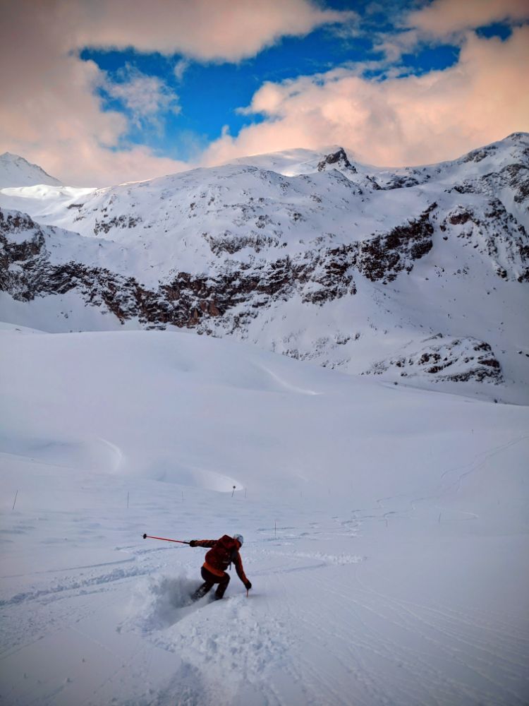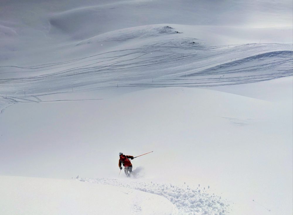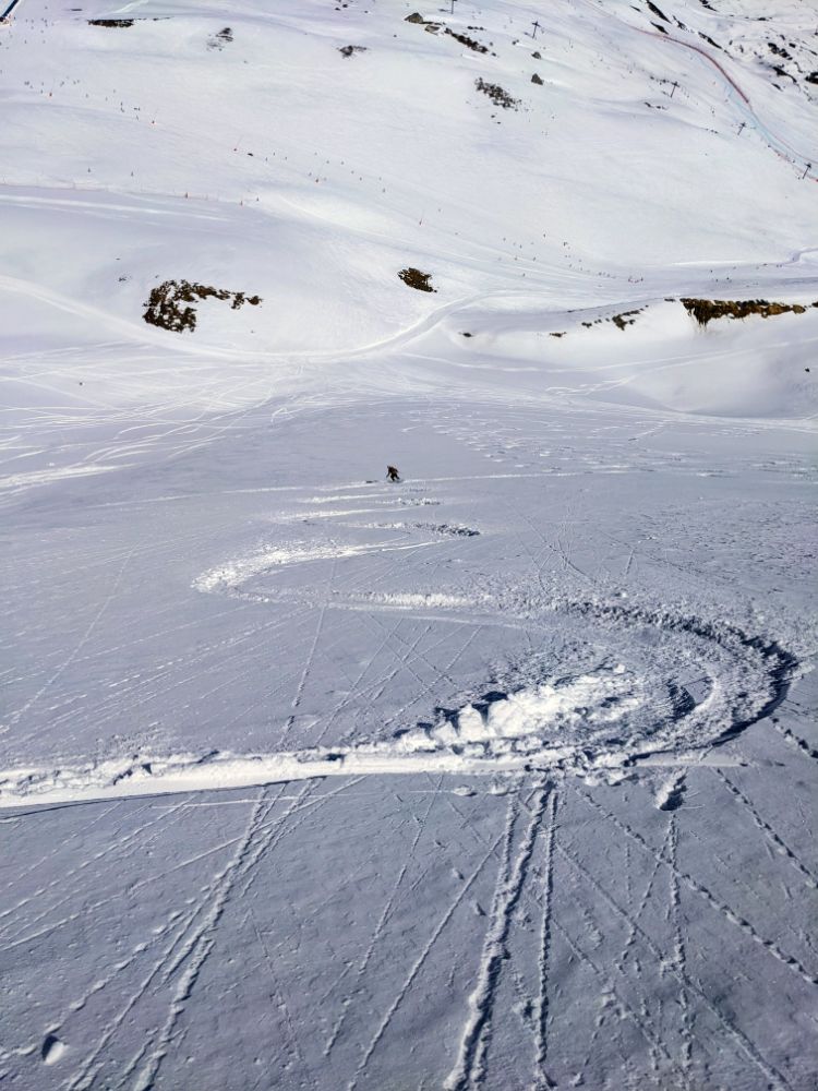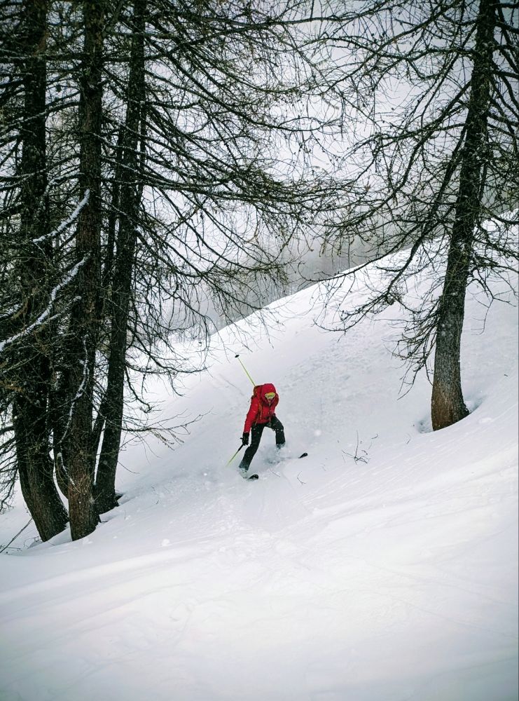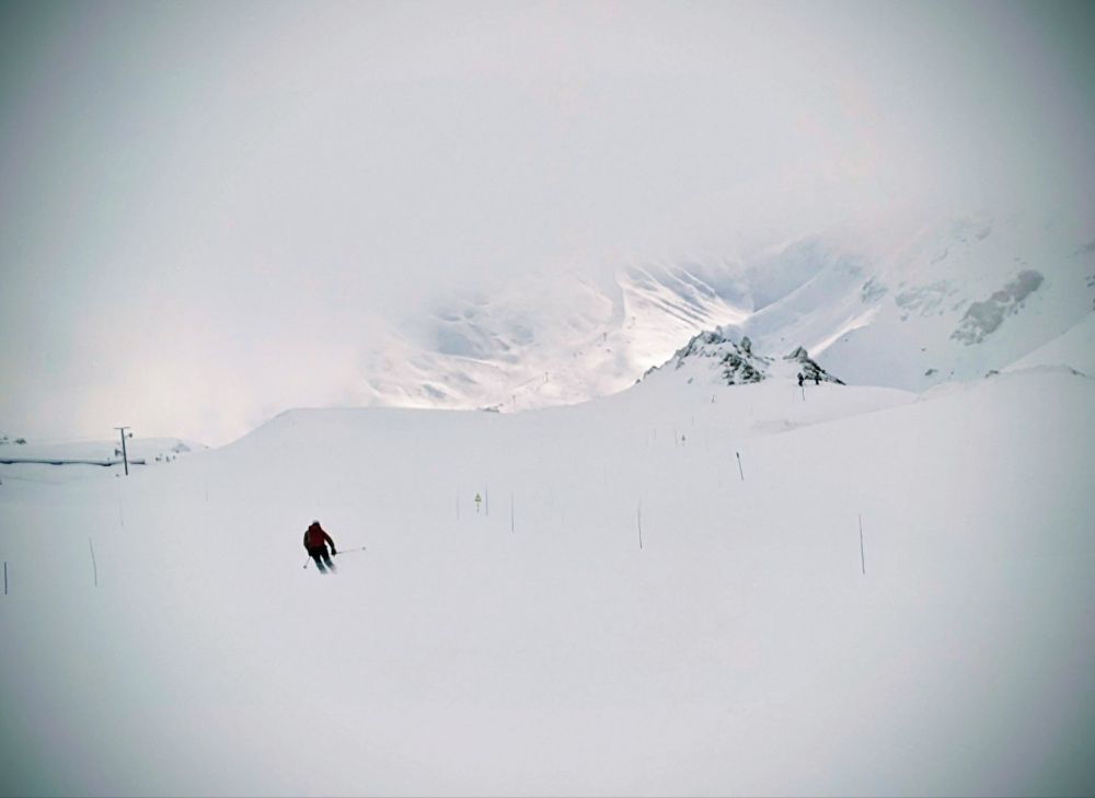 (re)exploring the resort pistes before quickly moving off piste for varied conditions: first hunting trees (hard to find) for low vis skiing, then hunting powder (easy, then increasingly hard) and avoiding crusts (except for lunchtime).
