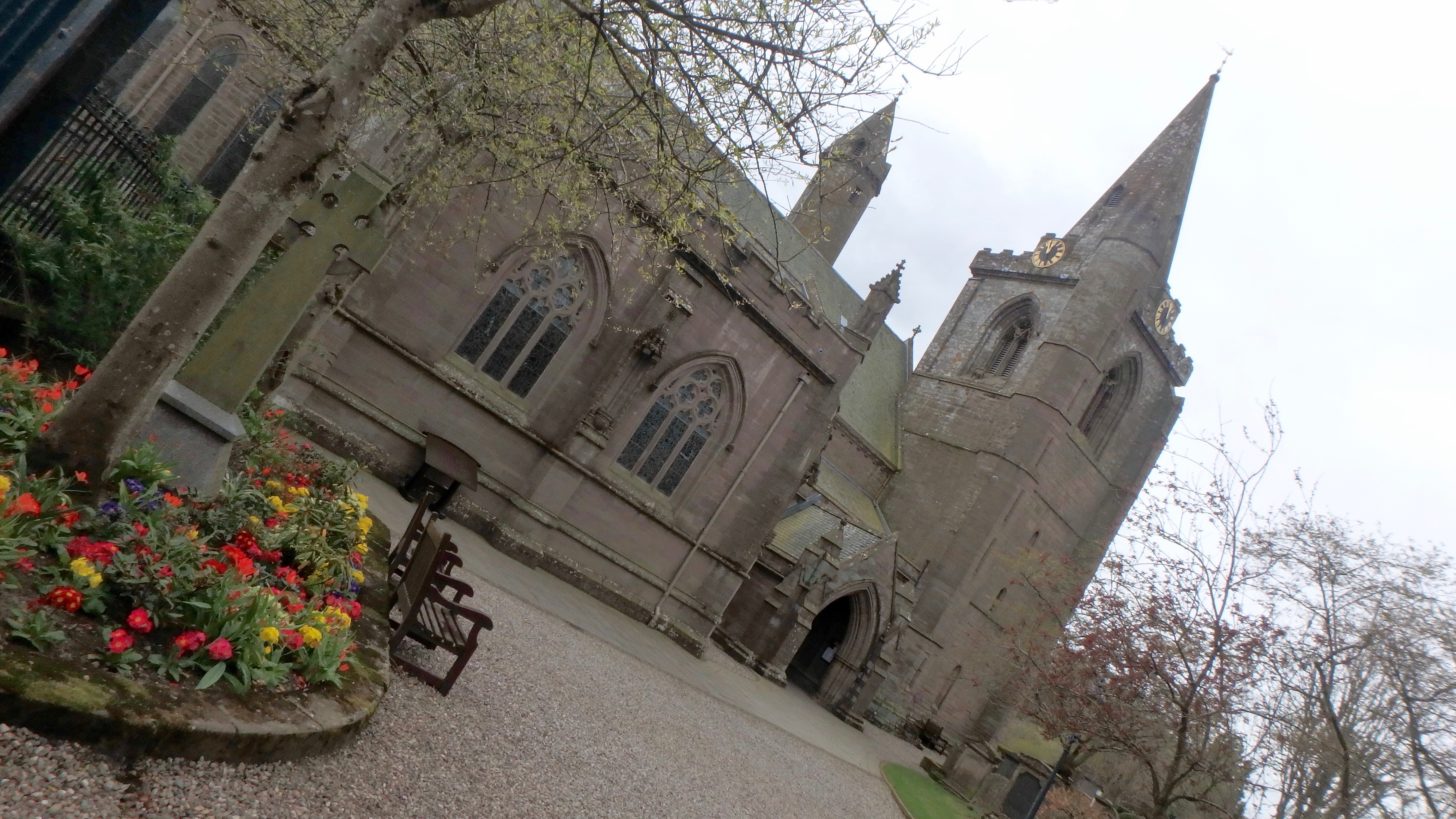 OLYMPUS DIGITAL CAMERA Published April 22, 2017 at 4608 × 2592 in OLYMPUS DIGITAL CAMERA Brechin cathedral (apologies for the jaunty angle – it was the easiest way to get the flowers and the tower in…)